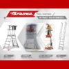 SUPER TELES drabina przegubowa, teleskopowa. W drabinach zastosowano wzmocnione, anodyzowane, niebrudzące podłużnice aluminiowe. Szczeble o przekroju 30×30 mm, zamontowano w górnym elemencie drabiny, z zastosowaniem metody wpuszczania ich w podłużnice. Drabina nitowana.