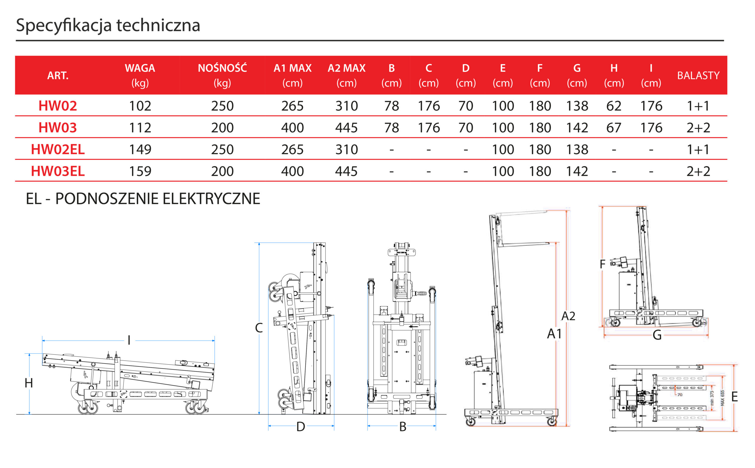 - Wersja manualna oraz elektryczna (Wyposażony w elektrohydrauliczny układ podnoszenia, akumulatorami 24V).