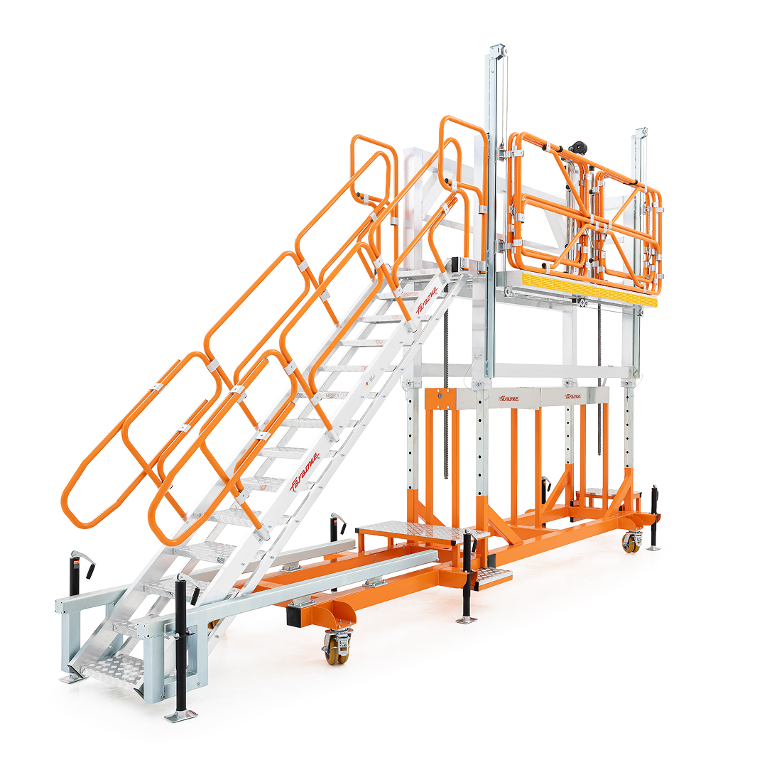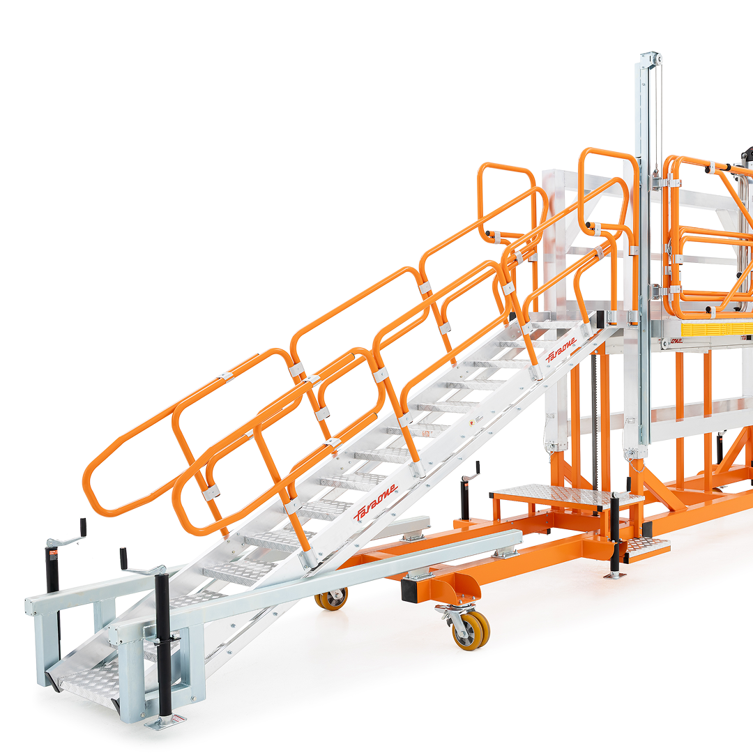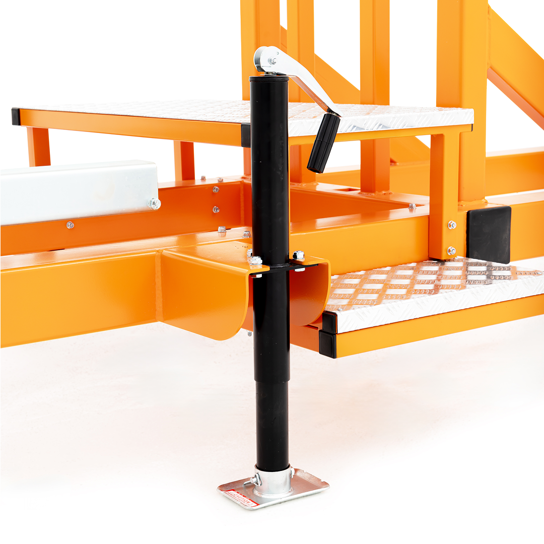 Centralnym elementem podestu jest mechanizm korbowy umożliwiający płynną, precyzyjną regulację wysokości platformy. Kąt nachylenia schodów automatycznie dostosowuje się do bieżącego poziomu roboczego, zapewniając bezpieczne wejście niezależnie od ustawienia.