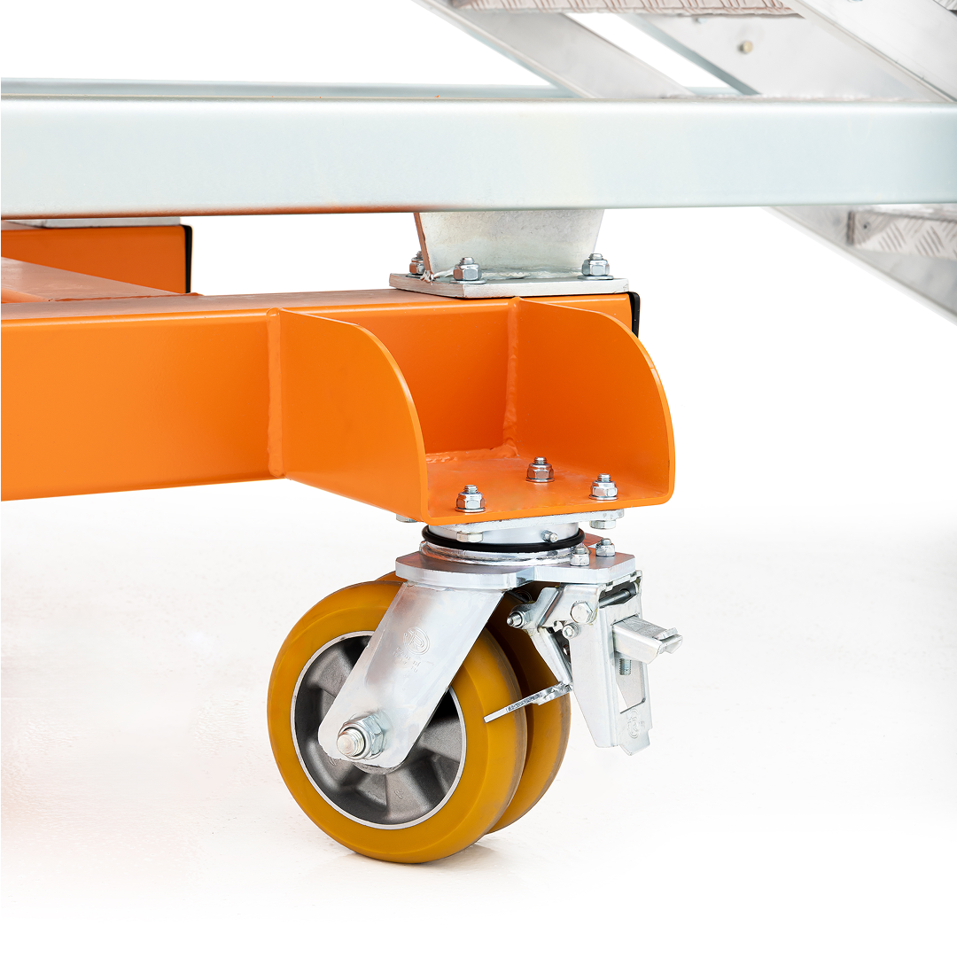 Podest został osadzony na dużych, podwójnych kołach wyposażonych w hamulce naciskowe, obsługiwane wygodnie podeszwą – bez potrzeby schylania się. Dzięki temu SPEC SM0103 można swobodnie przemieszczać po hali, a następnie stabilnie unieruchomić dokładnie tam, gdzie jest potrzebny.