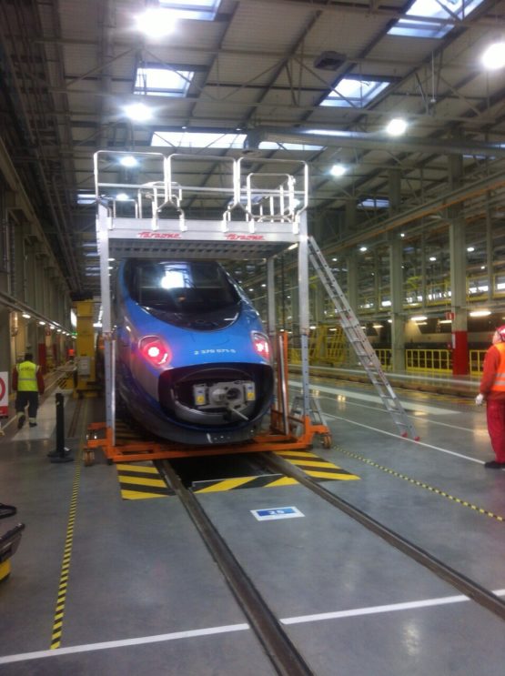 Podest z regulacją wysokości i prześwitem pozwalającym na najazd nad dziób pociągu. Umożliwia  dostęp do szyb i reflektorów.