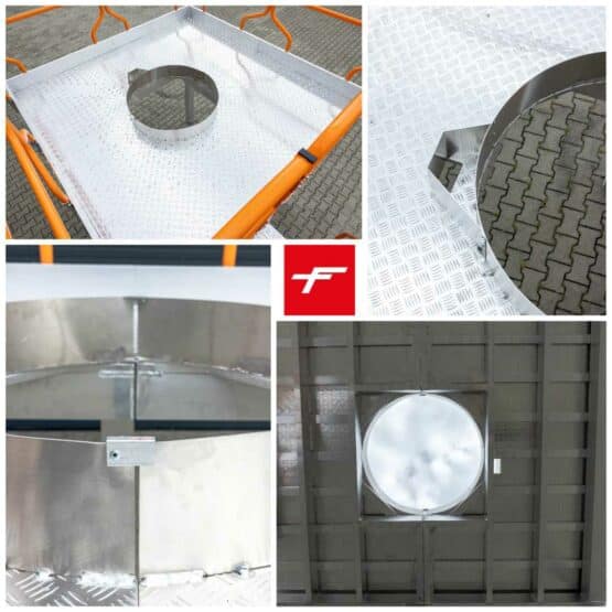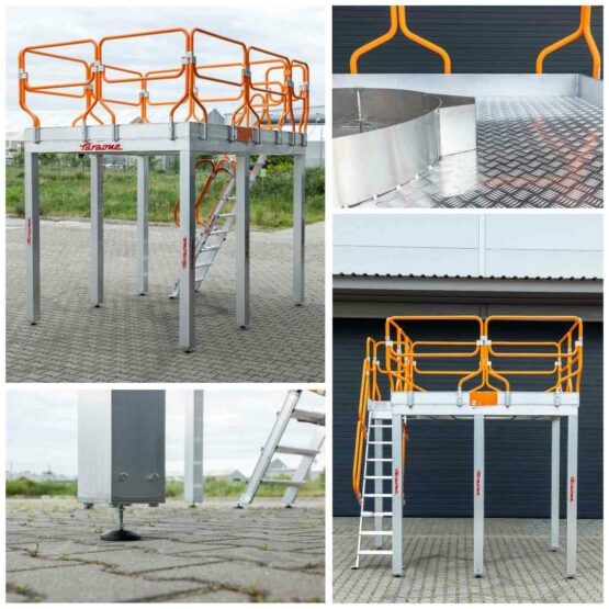 Powierzchnia platformy wykonana z antypoślizgowej, ryflowanej blachy. Otwór w podeście zabezpieczony burtą z blachy aluminiowej o wysokości 150 mm.