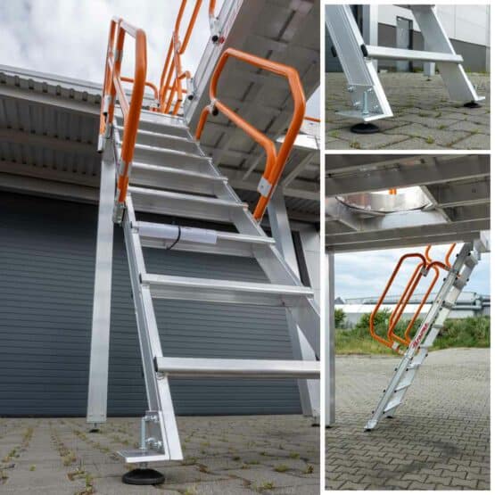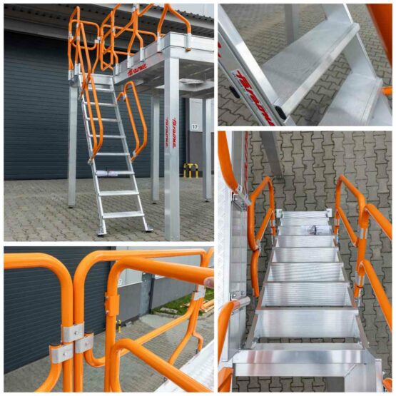 Z uwagi na wysokość konstrukcji – platforma robocza zawieszona na ponad 2 metrach – podest wyposażony w głębokie antypoślizgowe schody z poręczami o kącie nachylenia 60 stopni.